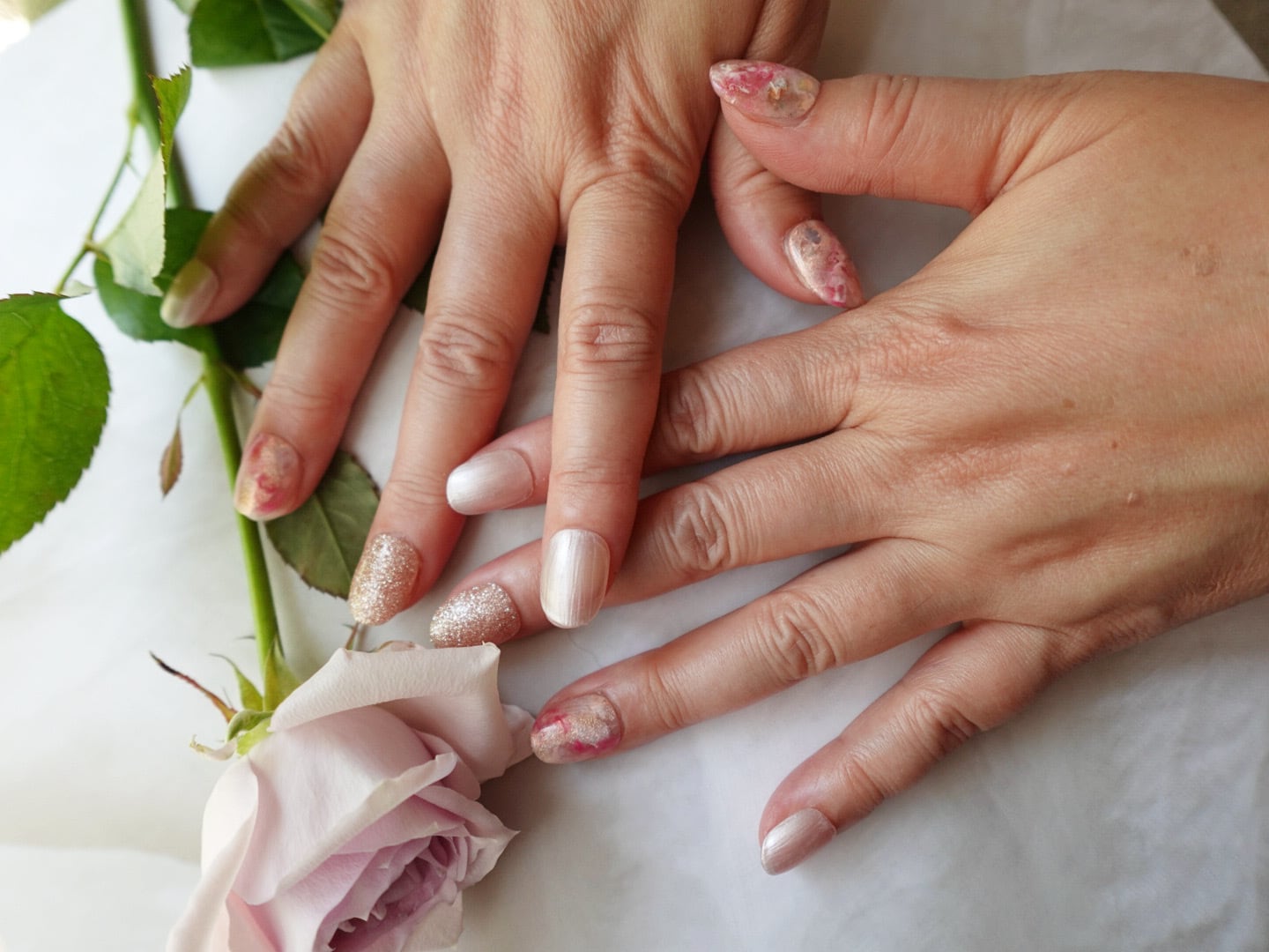 着用動画をインスタグラムに載せてます 良かったら見てくださいね♪ キラリと輝くガラスフレンチネイル くすみピンクで年中使える定番に