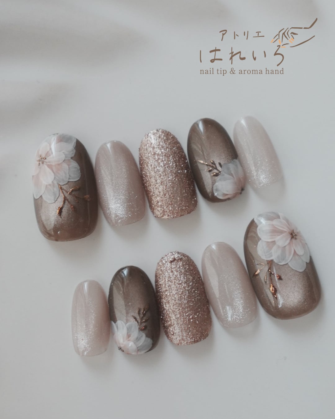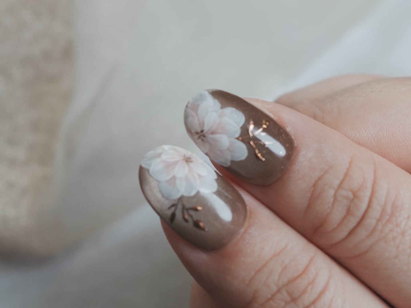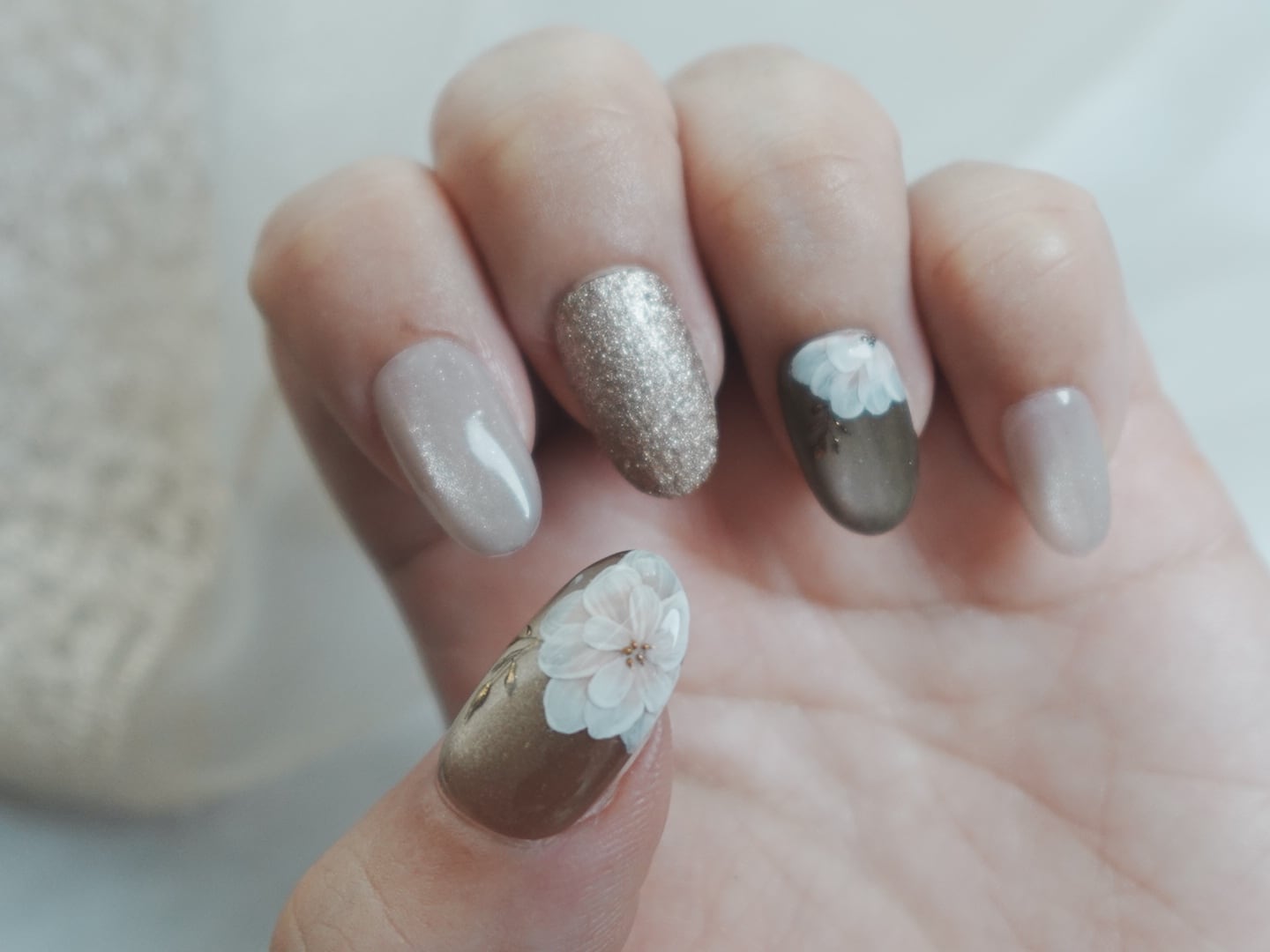 やさしく咲く白い花 ほろ苦い大人のブラウンネイル