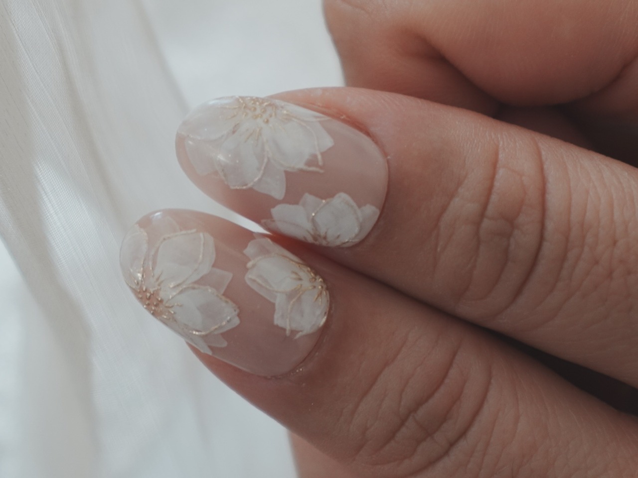 親指と薬指はふんわり白フラワーをやさしいピンクで包み