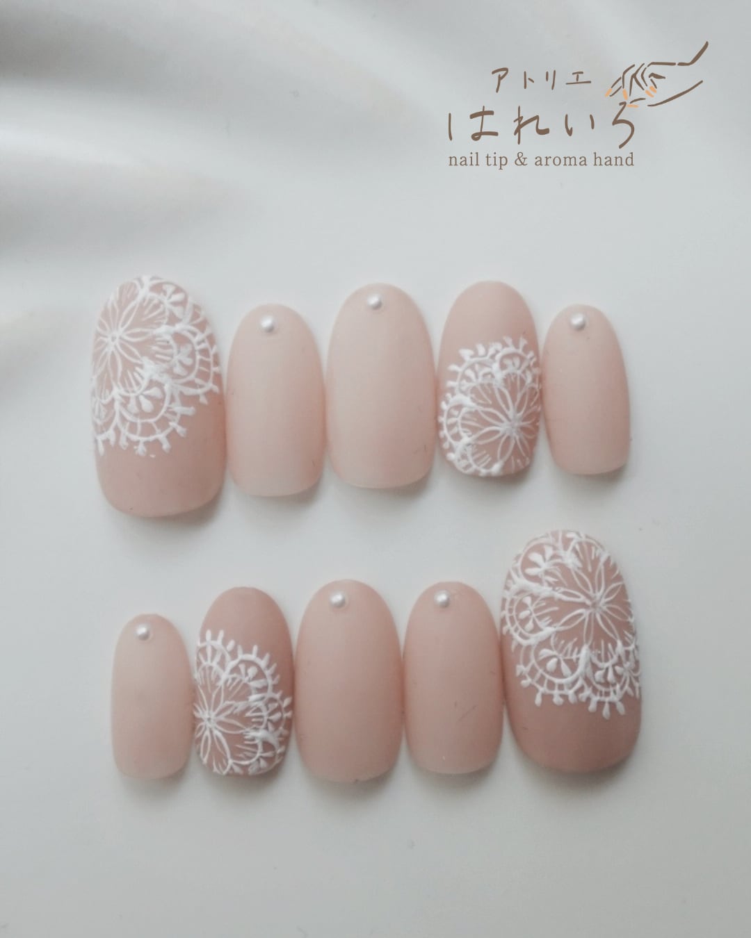 ふんわりとしたマットピンク色が特徴のこのレース柄ネイルは、女性らしさを引き立てるデザインです。