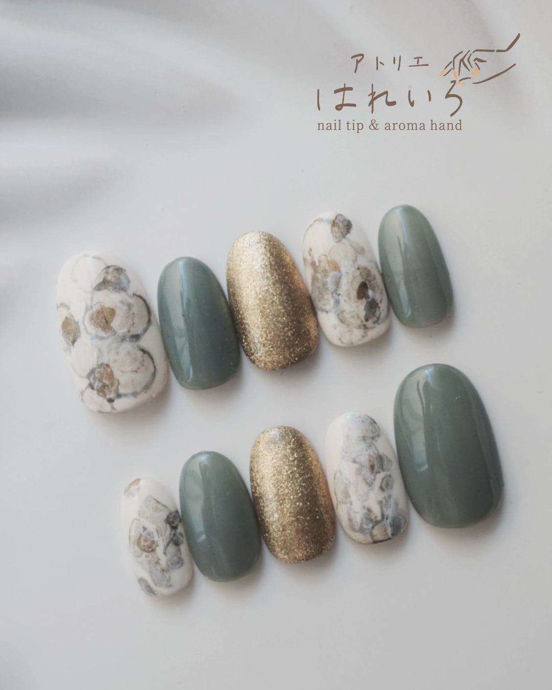 グリーン ゴールド ゴールドニュアンス柄ネイル