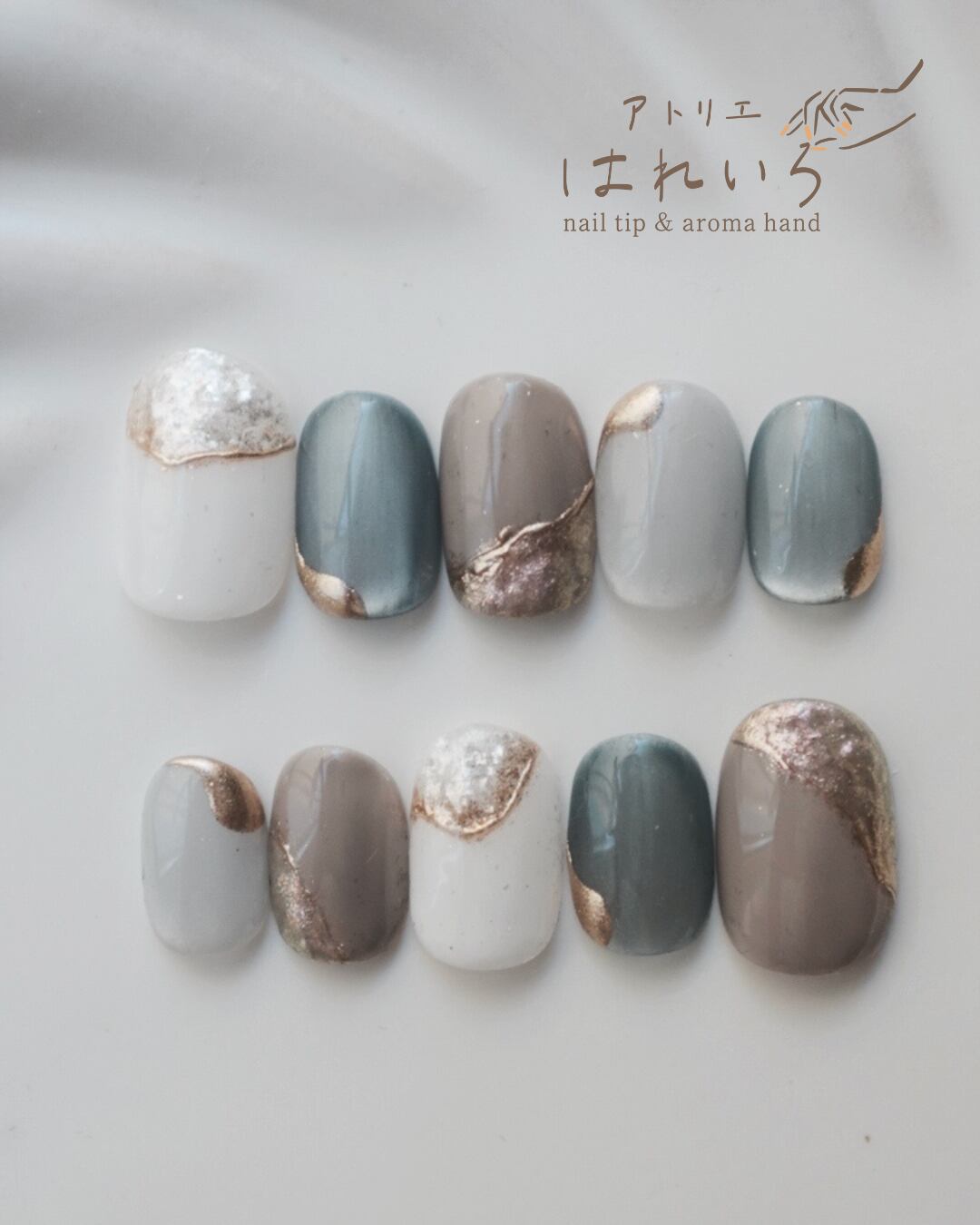 落ち着いたブルーとグレーのネイルと、